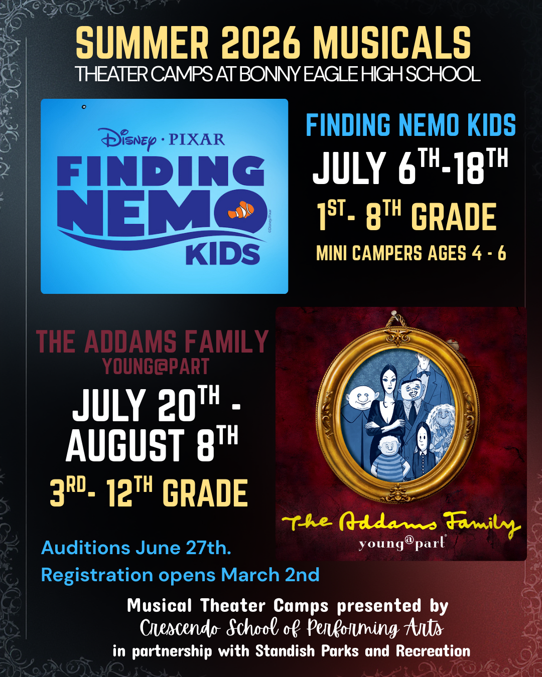 Auditions are planned for Saturday, July 12th at 9AM for Mini- Campers, and 10AM for Full Campers at Crescendo School of Preforming Arts. Call-backs will be at 2PM (Alterative Audition options may be offered on a Case-by-case bases for students unable to attend the primary Audition)